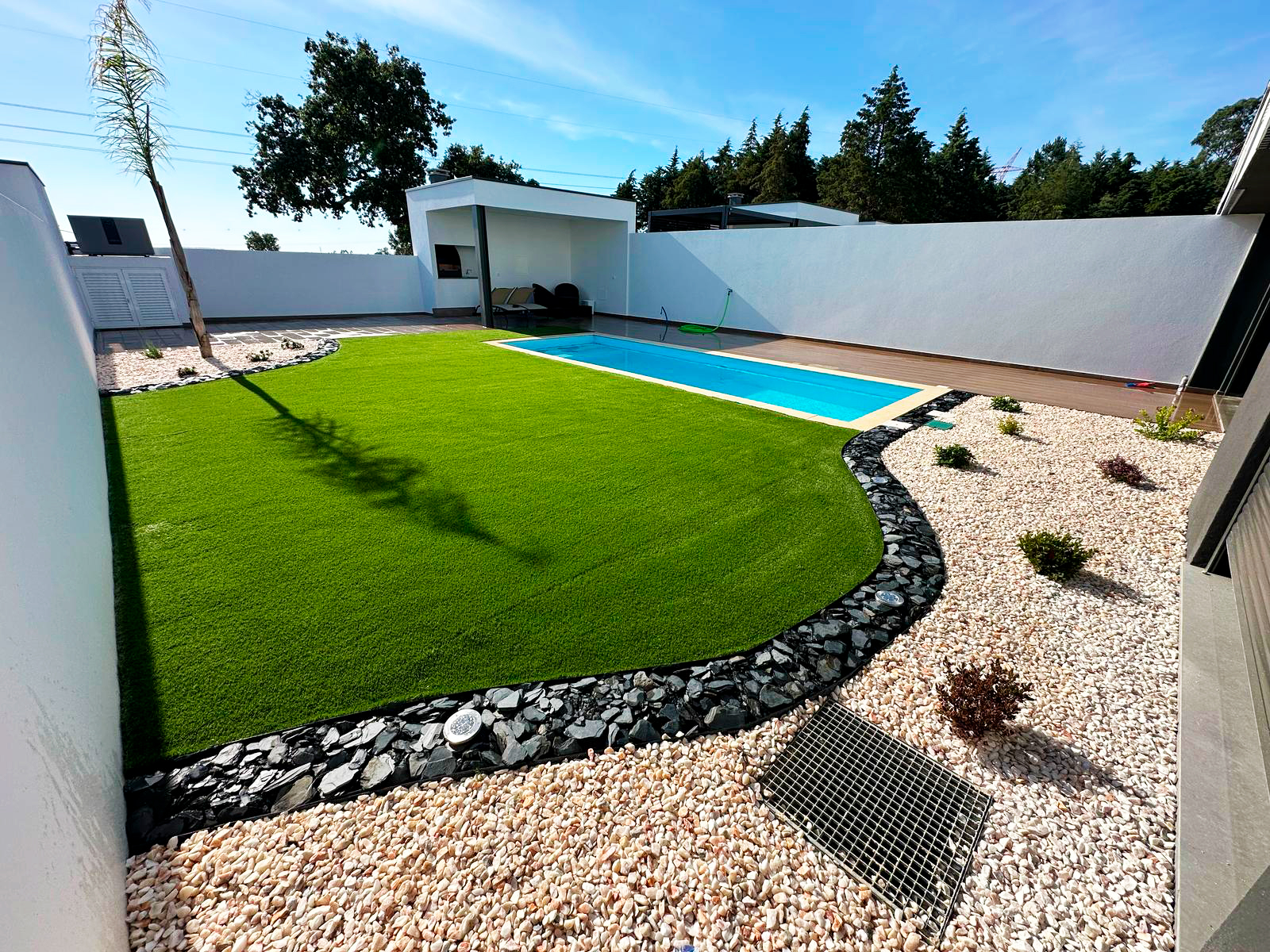 Construímos piscinas e áreas de convívio que se integram harmoniosamente no seu jardim.